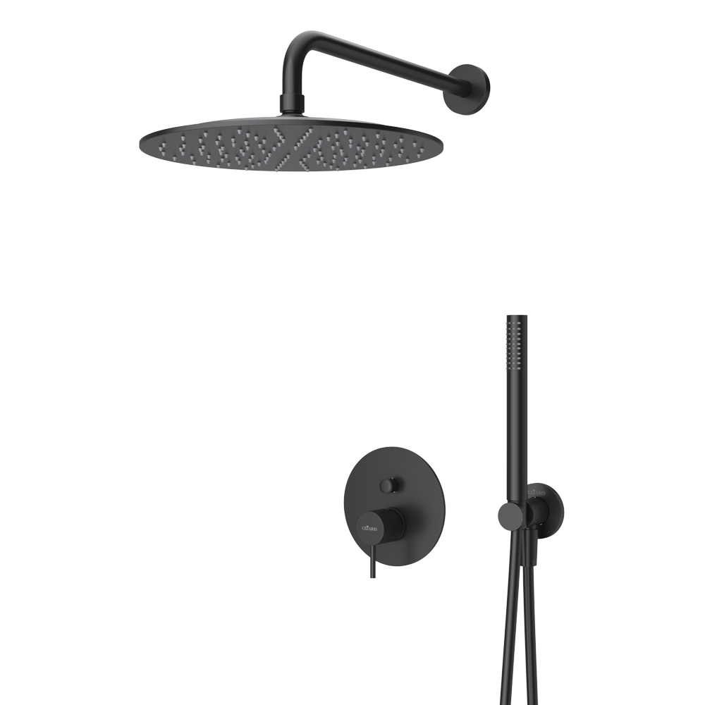 LEAF-DSIP-30-L-NOP Душевая система с дивиатором для верхнего и ручного душа, верхний душ из стены 30 см, исполнение Чёрный матовый